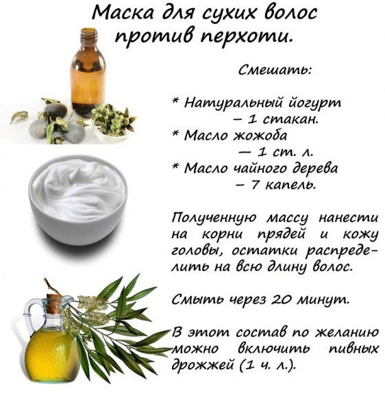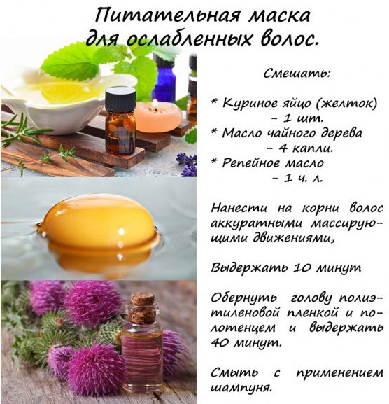 اختر زيت الزيتون أو اللوز أو زيت الجوجوبا كمكون رئيسي. تخلط جميع المكونات جيدا. ضع المنتج على فروة الرأس. لفه بورق القصدير والمنشفة. أو خذ قبعة خاصة. اغسلي شعرك بعد 20 دقيقة.