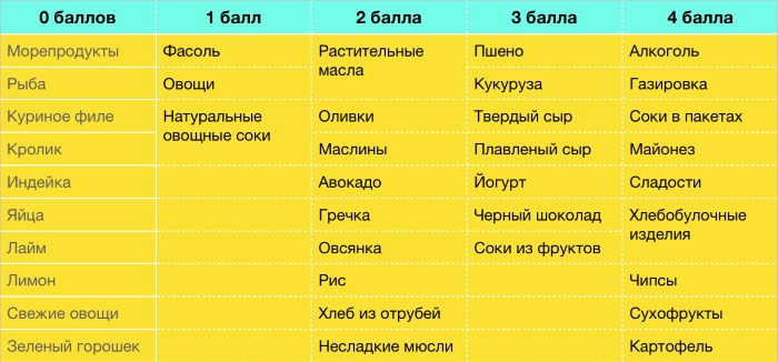 هناك العديد من الجداول الخاصة بالنظم الغذائية الأيضية التي تسرد الكربوهيدرات والسعرات الحرارية في الأطعمة. يعتمد عدد النقاط اليومية أيضًا على مرحلة النظام الغذائي. هناك 3 منهم.
