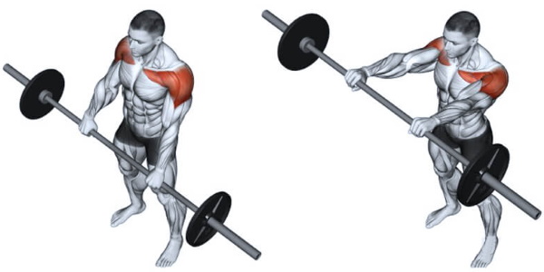 يعد رفع القضيب إلى الذقن أمامك تمرينًا فعالًا للتطور النشط للعضلات الدالية والفخاخ. هناك طريقتان لسحب الرافعة المميتة: بقبضة ضيقة أو بقبضة واسعة. تسمح لك القبضة الضيقة برفع مرفقيك إلى أعلى مستوى ممكن ، وتساعد القبضة العريضة على تخفيف الحمل على الكتفين وتنشيط عمل العضلات الدالية الوسطى ، مما يساعد على زيادة حجم الكتفين بصريًا.