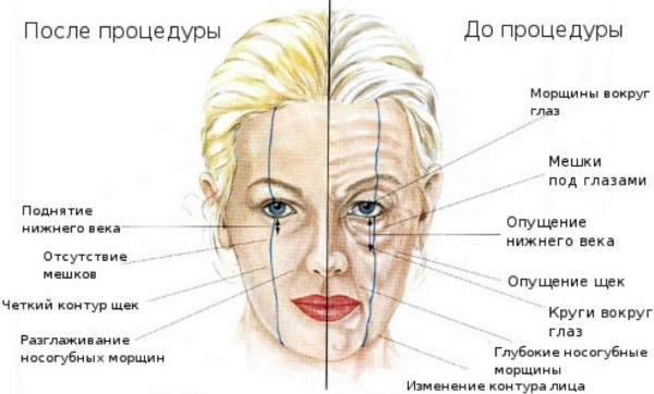 - القضاء على التجاعيد الأمامية ، الدمية ، الأنفية الشفوية ، الطيات من أي عمق ؛