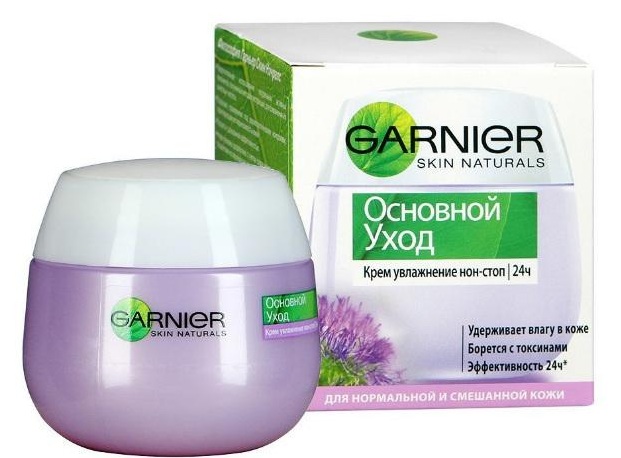 - غارنييه للعناية الأساسية كريم يرطب البشرة طوال اليوم ويعطي تأثير النضارة والإشراق الطبيعي. الكريم جيد لأنه لا يترك علامات دهنية على الجلد ، وسريع الامتصاص ، ويتكون من مكونات طبيعية وله ملمس ناعم. السعر 265 روبل روسي