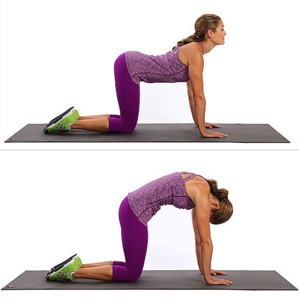 Anda perlu berlutut, bersandar pada tangan, menjaga punggung lurus, melihat lurus ke depan. Setelah bernafas, anda perlu menundukkan kepala, sambil melengkungkan punggung secara serentak seolah-olah badan digantung oleh mata kail.