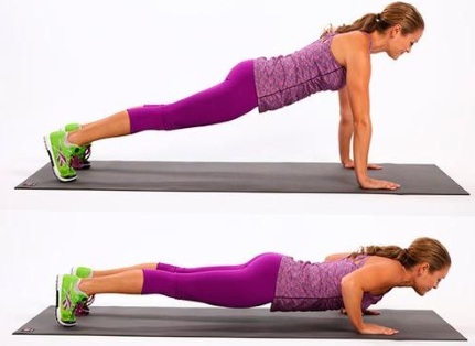 Latihan membakar lemak harus lebih dinamik daripada latihan membina otot. Ini adalah pelbagai jenis push-up: dari dinding, di lutut, dari lantai. Anda harus memulakan dengan jenis yang lebih mudah dan secara beransur-ansur beralih ke yang kompleks. Bilangan push-up semasa latihan pertama sekurang-kurangnya 10 kali, maka jumlah pengulangan secara beransur-ansur meningkat.