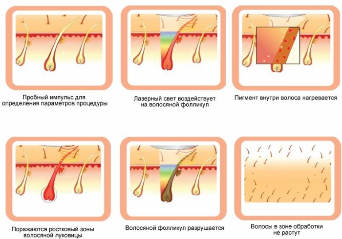 Pancaran radas mempengaruhi pigmen melanin. Akibatnya, folikel rambut akan musnah dan rambut akan gugur dan tidak lagi tumbuh. Oleh itu, semakin terang perbezaan antara warna kulit dan warna rambut, semakin baik hasilnya.Masa pemprosesan untuk tempat-tempat intim akan memakan masa sekitar lima belas minit. Kesannya akan bertahan sehingga tiga bulan.
