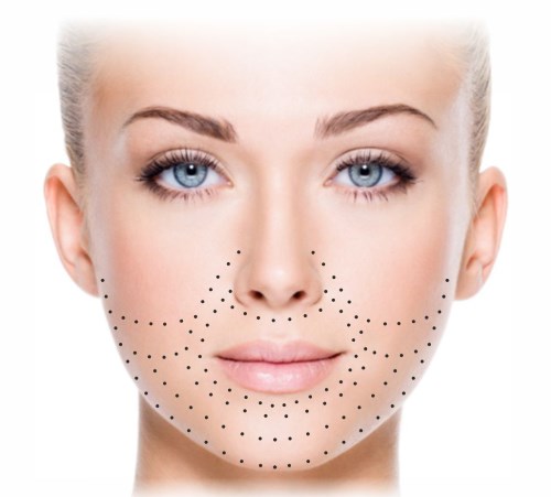 | Técnica papular | A formação de pápulas pela injeção da droga em um ângulo de 45 graus. Áreas de uso: testa, área dos olhos, bochechas, maçãs do rosto, maxilar inferior. |