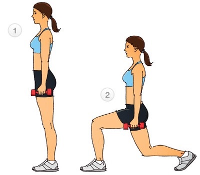 - Устаните усправно, руке са бучицама су спуштене дуж тела. Направите корак ногом, одмарајући се на целој површини стопала.