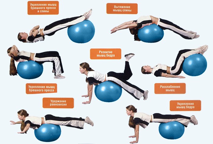 - Вежба 1. Почетни положај: лежећи на леђима, подигните ноге на лопту тако да стопала не додирују пројектил. Тада се карлица мора подићи и почети да котрљате фитбалл ногама што ближе себи.