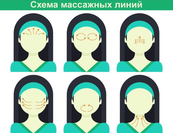 Сви покрети прстију и дланова требају бити усмерени строго дуж масажних линија, почев од централног дела лица и постепено се крећући према темпоралним режњевима. Масирајте чело правилно у правцу од обрва до косе (ни у ком случају не преко). Врат се масира од основе до браде и преко. Једна од популарних техника само-масаже са правцима линија приказана је на слици.