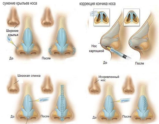 ด้วยความช่วยเหลือของการฉีดฟิลเลอร์มันเป็นไปได้ที่จะบรรลุผลของการปรับมุมในบริเวณปีกจมูกให้เรียบเพื่อให้ปลายของมันแหลมน้อยลงและเพื่อคืนความสมมาตรให้สัมพันธ์กับองค์ประกอบอื่น ๆ ของแผ่นดิสก์บนใบหน้า