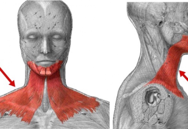 - ให้ศีรษะตรงคุณต้องดึงคางขึ้นราวกับว่าพยายามแสดงให้พวกเขาเห็นเพดาน วิธีนี้จะทำให้กล้ามเนื้อคอด้านหน้าตึงขึ้น พยายามที่จะไม่ผ่อนคลายความตึงเครียดคุณต้องค่อยๆยกและลดขากรรไกรล่างหลาย ๆ ครั้ง ในขณะเดียวกันมือก็นอนอยู่ใต้หน้าอก คุณต้องดำรงตำแหน่งที่ตึงเครียดเป็นเวลา 5 วินาที
