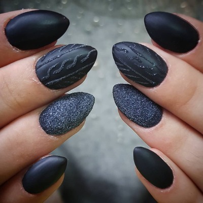 Thiết kế móng tay màu đen, với sơn bóng đen từ cửa hàng gần nhất, có thể được sơn mờ. Để làm được điều này, sau khi sơn móng tay, trước khi chúng khô hoàn toàn, bạn cần chần tay qua nước sôi đang bốc hơi và không phủ sơn định hình.