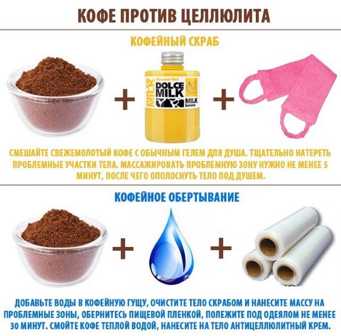 - Cà phê và đường. Thành phần có tác dụng tẩy tế bào chết nhẹ, nuôi dưỡng và làm đều màu da. Để chuẩn bị hỗn hợp cà phê-đường, bạn phải trộn 3 muỗng canh. đường, 1/4 tách cà phê xay, thêm 2 muỗng canh. dầu ô liu hoặc dầu dừa.