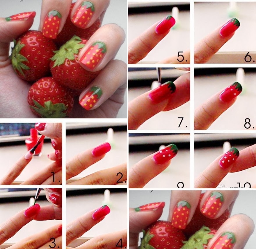 Một lớp sơn chuẩn bị được phủ lên móng tay, sau đó là một lớp sơn bóng màu đỏ, sẽ tạo ra cùi của quả mọng. Ở phần trên của móng, kẻ 2 đường thẳng song song, 1 - salat, 2 - xanh đậm. Khi tất cả mọi thứ đã khô, nó vẫn còn để làm cho các hạt với dầu bóng đen và cố định kết quả bằng một lớp trên, điều này sẽ làm tăng độ bền của móng tay.