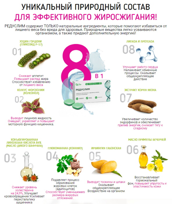 Reduslim là một phương thuốc thảo dược tự nhiên có tác dụng lipotropic. Viên uống bổ sung chế độ ăn uống được sử dụng để giảm cảm giác thèm ăn, dẫn đến giảm cân.